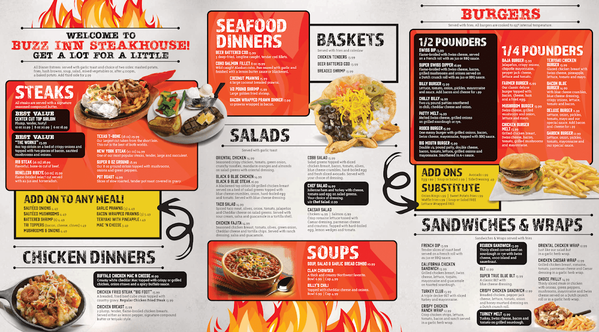 As a steakhouse, the menu at Buzz Inn is as formidable as it is inviting. Choose from a variety of chicken dinners, including the savory Chicken Fried Steak “Big Foot,” which promises to satisfy those big appetites. The burgers are equally impressive, with options like the classic Billy Burger and the flavorful Bacon Blue Burger that will satiate any burger aficionado. And if you're in the mood for a little twist, don’t miss the Buffalo Chicken Mac N Cheese—a combination of creamy comfort and flavorful heat that will have you coming back for more.