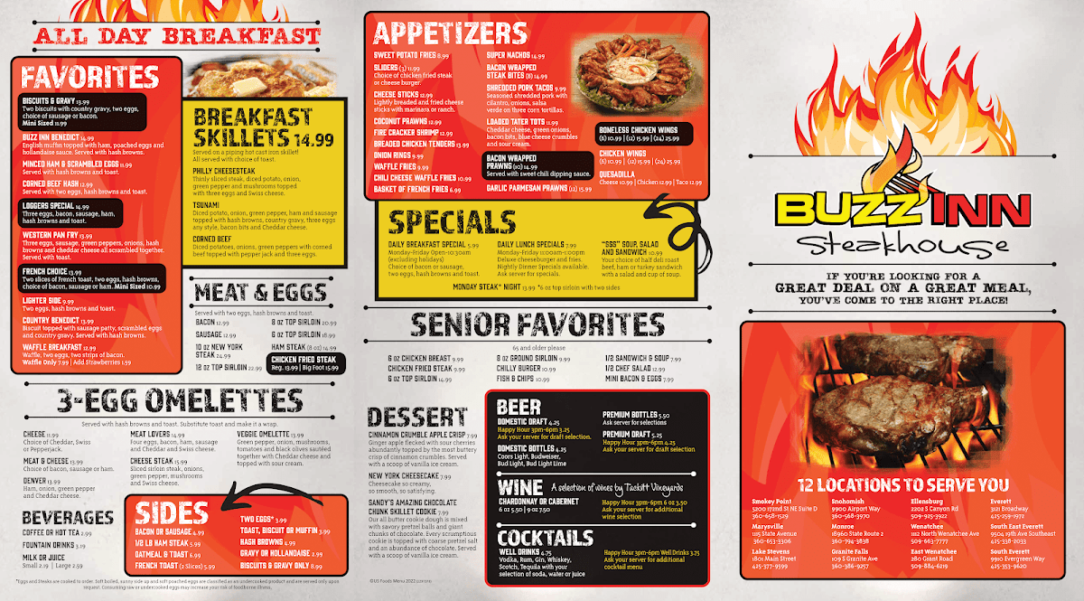 Welcome to the Buzz Inn Steakhouse, your go-to destination for mouthwatering steaks and a vibrant atmosphere in Everett, WA. Nestled at 9504 19th Ave SE, this beloved local gem serves up a hearty selection of dishes that cater to every craving, from succulent steak dinners to satisfying burgers, ensuring that every bite is a delight.